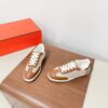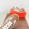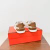 This pair of Hermès white leather sneakers offers a clean, sophisticated look with minimalist detailing. The shoes are crafted from smooth white leather with subtle perforated accents forming the iconic “H” logo on the sides. The fine contrast stitching in warm tan adds a touch of elegance, while the sturdy rubber sole ensures durability and comfort.