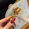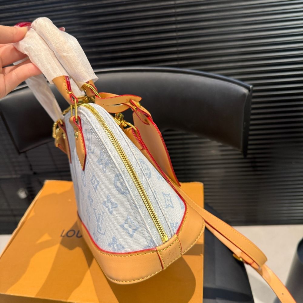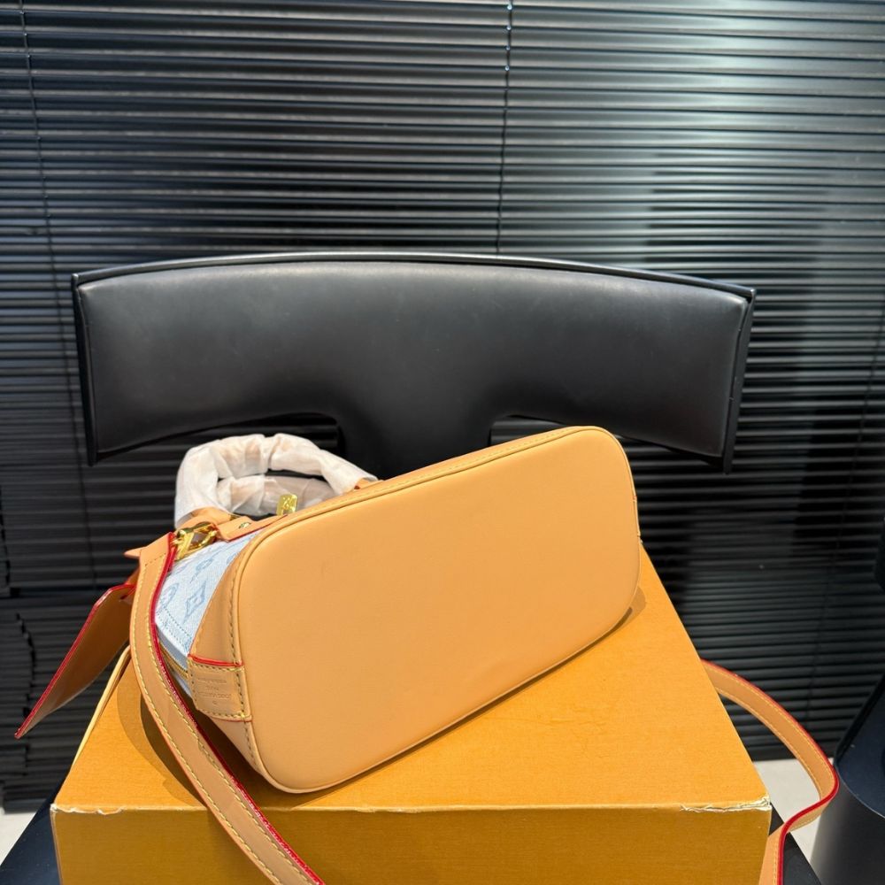 Part of a collection celebrating the 130th anniversary of the Monogram pattern, the Alma BB bag is reimagined with classic Monogram Origine Canvas inspired by Louis Vuitton’s heritage, combined with the elegant Monogram Origine Bleu Courrier color. The brand’s signature is further showcased through the iconic lock and a special commemorative address tag. The design is completed with smooth leather trim and a striped fabric lining.