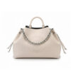 The Louis Vuitton Bella Tote in beige crafted from exceptionally soft, perforated Mahina leather. It features a gentle, draped silhouette accented by a distinctive braided leather-and-chain handle and an embossed LV Circle signature on the front. This functional tote offers a spacious interior with organized compartments, complemented by a detachable, adjustable leather strap for versatile shoulder or crossbody wear.