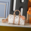 The Louis Vuitton Keepall Bandoulière 25 in Monogram Beige is a compact interpretation of the Maison’s iconic travel bag, crafted from durable Monogram coated canvas in a sophisticated neutral palette. This miniature duffle features smooth leather trim, including rolled top handles and a secure double-zip closure accented by polished gold-tone hardware. Designed for versatile daily use, it comes with a detachable and adjustable wide textile strap, allowing for comfortable shoulder or crossbody carry. This stylish accessory perfectly blends heritage travel aesthetics with modern, small-scale functionality.