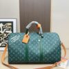 The House’s iconic Keepall Bandoulière 50 bag is made from colorful Monogram Heritage canvas with matching leather trim and leather for the shoulder strap and removable name tag. It features the historic Marque L. Vuitton Déposée signature, a nod to the House’s long-standing legacy.