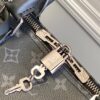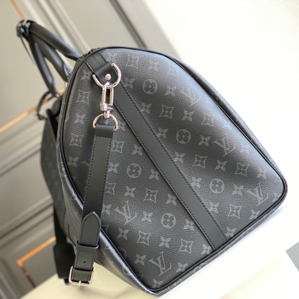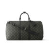 The Keepall Bandoulière 50 travel bag looks elegant in Monogram Eclipse coated canvas with black-leather trim and top handles. This cabin-friendly bag features the all the details associated with the historic Keepall line: lateral leather bands, rolled-leather top handles, padlock and removable name tag. The roomy interior includes a zipped pocket to keep things organized.