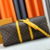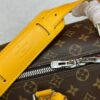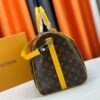 Brightly colored leather details bring a fresh feel to this Keepall Bandoulière 50 travel bag in Monogram Macassar canvas. The top handles, the removable shoulder strap, even the leather name tag, are all in the same bright color. The bag is lined in a striped textile inspired by the linings of the House’s original trunks.