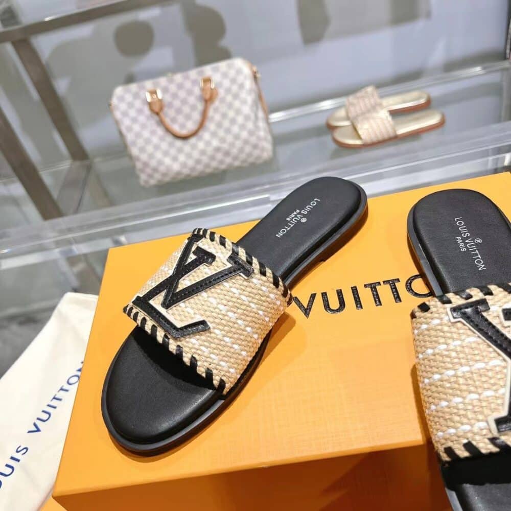 LOUIS VUITTON LOCK IT FLAT RAFFIA MULES BLACK