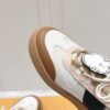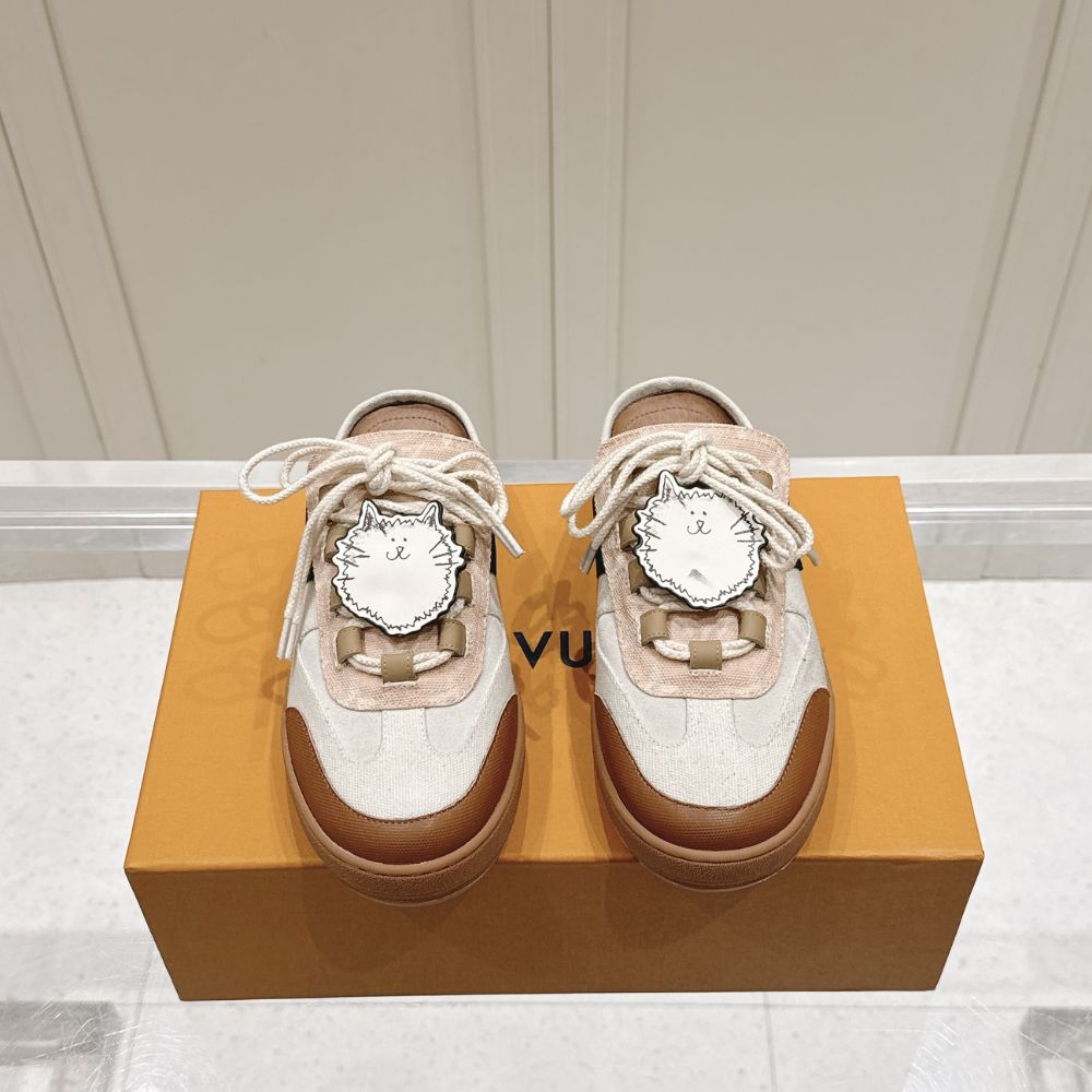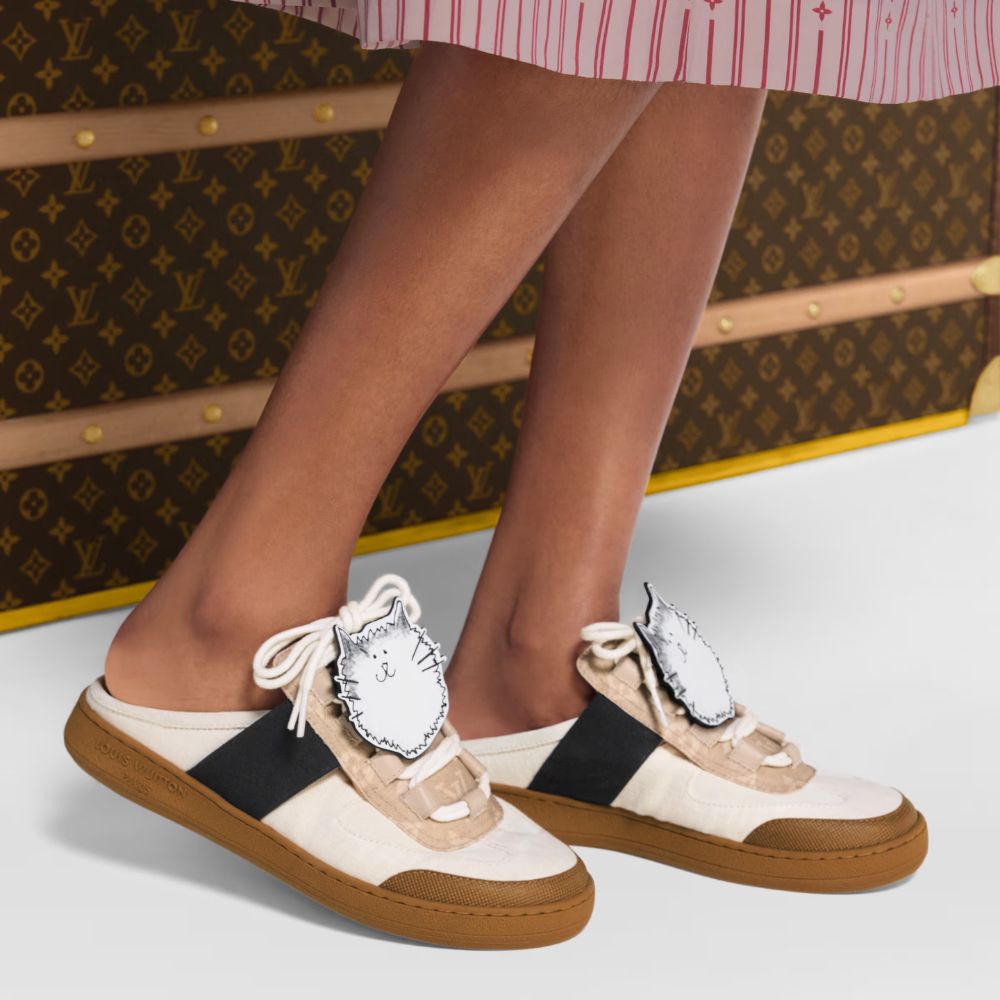 The Lous open-back sneaker is reworked this season in plain and Monogram-patterned canvas, while its double laces are embellished with a playful cat accessory. This versatile and stylish sneaker features discreet elastic inserts for easy fitting. It is finished with a supple rubber outsole bearing the Louis Vuitton signature.