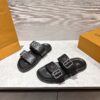 The LV Venice mule is a casual-chic style made of grained leather, which is debossed with the iconic Monogram pattern. The upper features two adjustable straps with large, angular buckles. A padded footbed and supple micro outsole make this model extremely light and comfortable to wear.