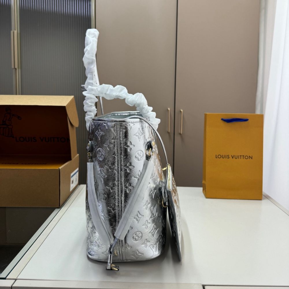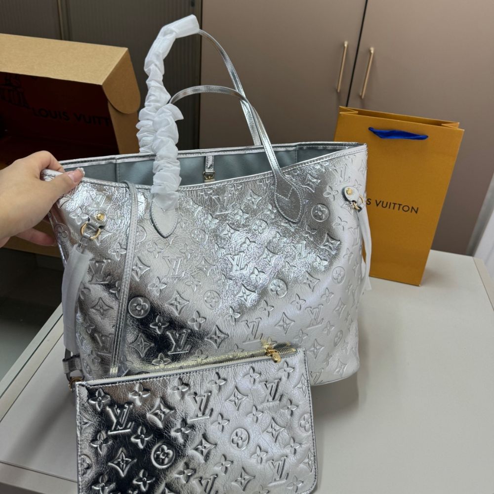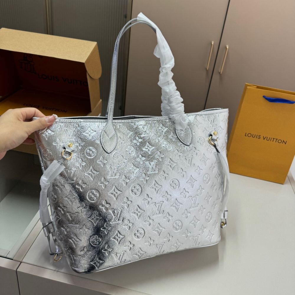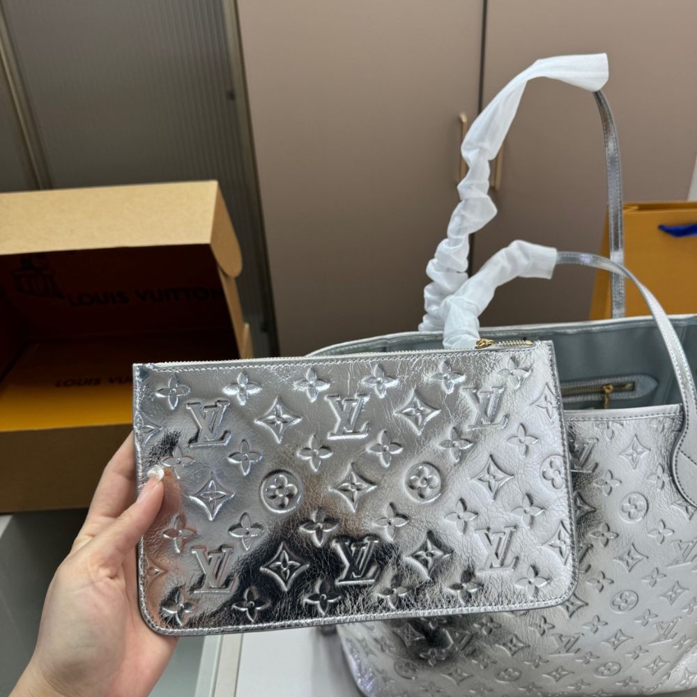 The Louis Vuitton Neverfull MM in Silver is edition of the Maison’s most versatile tote, crafted from metallic Monogram Empreinte leather. This model features a shimmering silver finish with the iconic Monogram motif embossed throughout, accented by polished silver-tone hardware for a sleek, monochromatic look. The spacious interior is lined with matching microfiber and includes a removable zipped pouch that can be used as a chic clutch or an extra pocket.