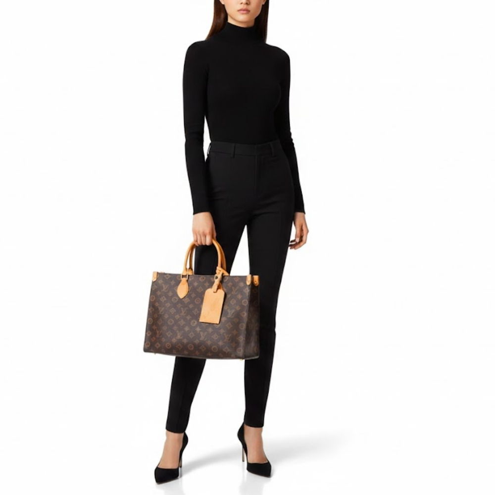 Reimagined for the 130th anniversary of the Louis Vuitton Monogram, this OnTheGo MM is offered in a chic Monogram Origine Ebène palette. It is crafted from Monogram Origine canvas, a vintage-inspired update on the original pattern, handle and signature address tag.