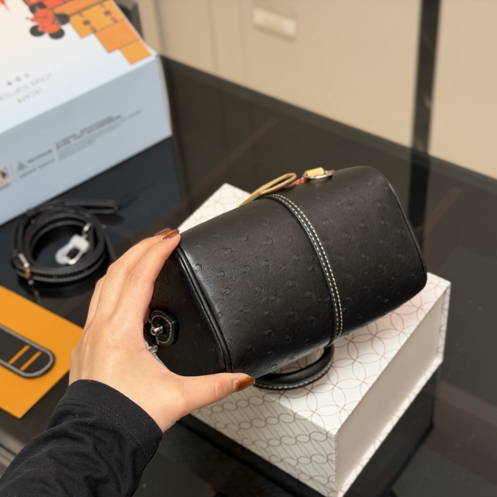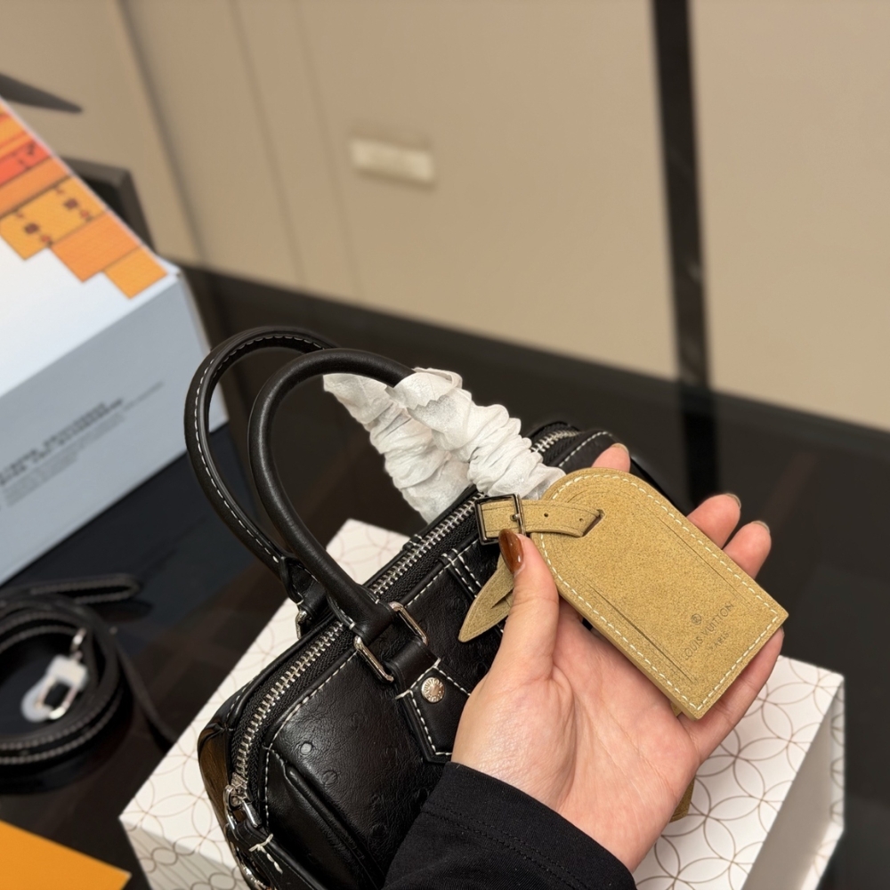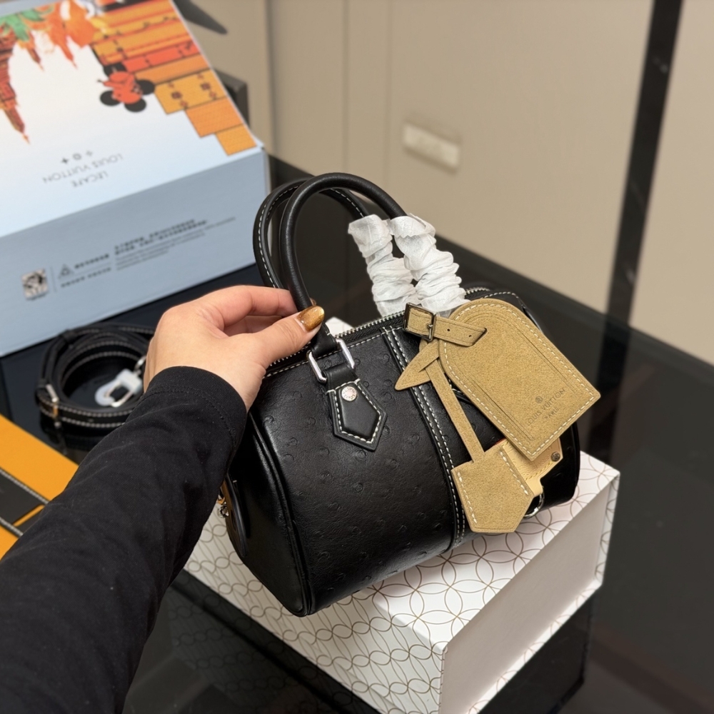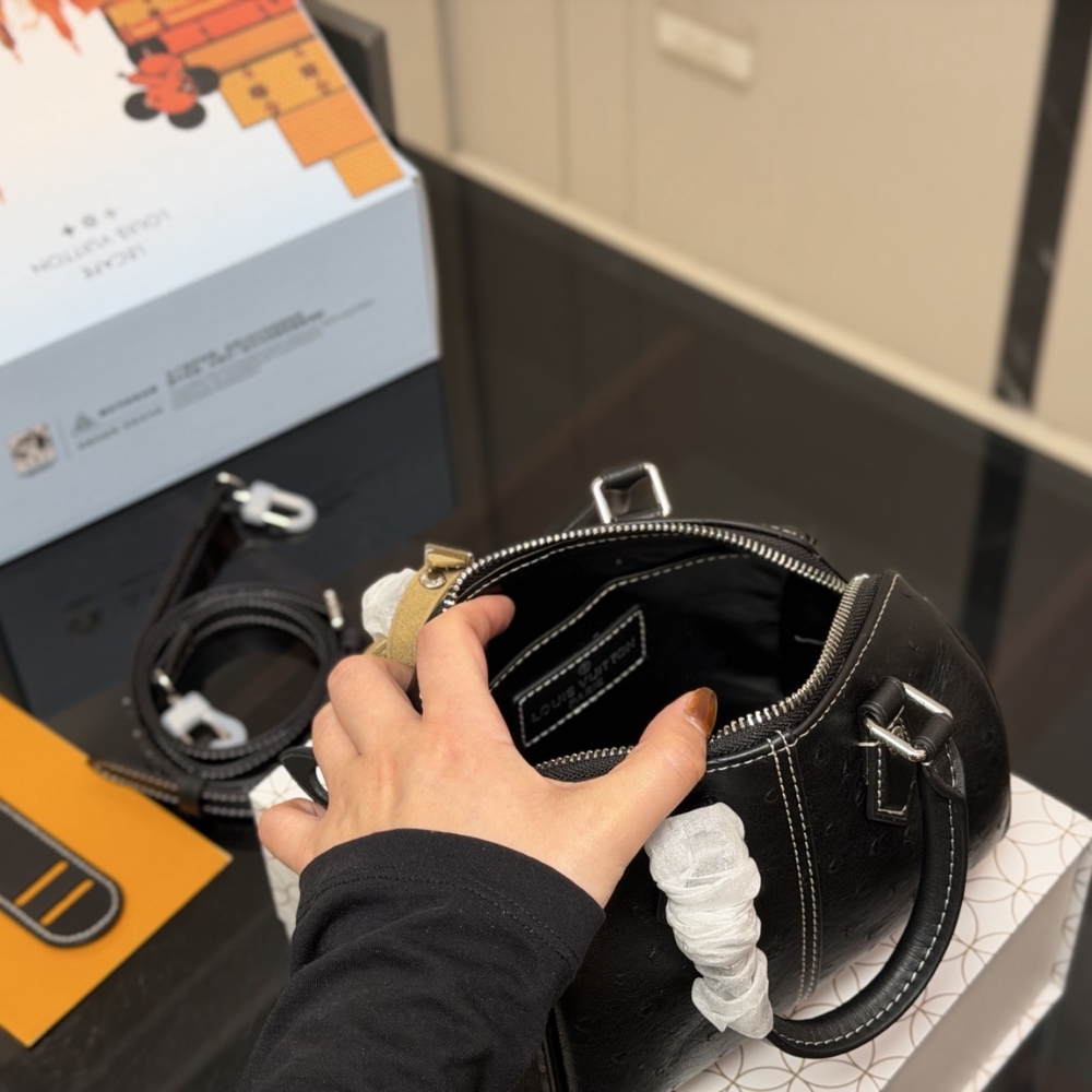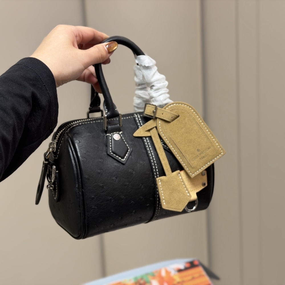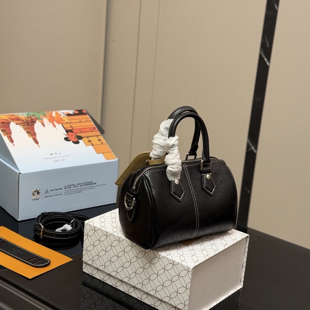 The Speedy 18 Bandoulière is a compact city bag crafted from ostrich leather and finished with matte hardware in silver tone. Including the rolled leather handles, handle mounts, key bell, and removable name tag, are accented with contrast stitching, lending the piece a distinctive workwear-inspired character.