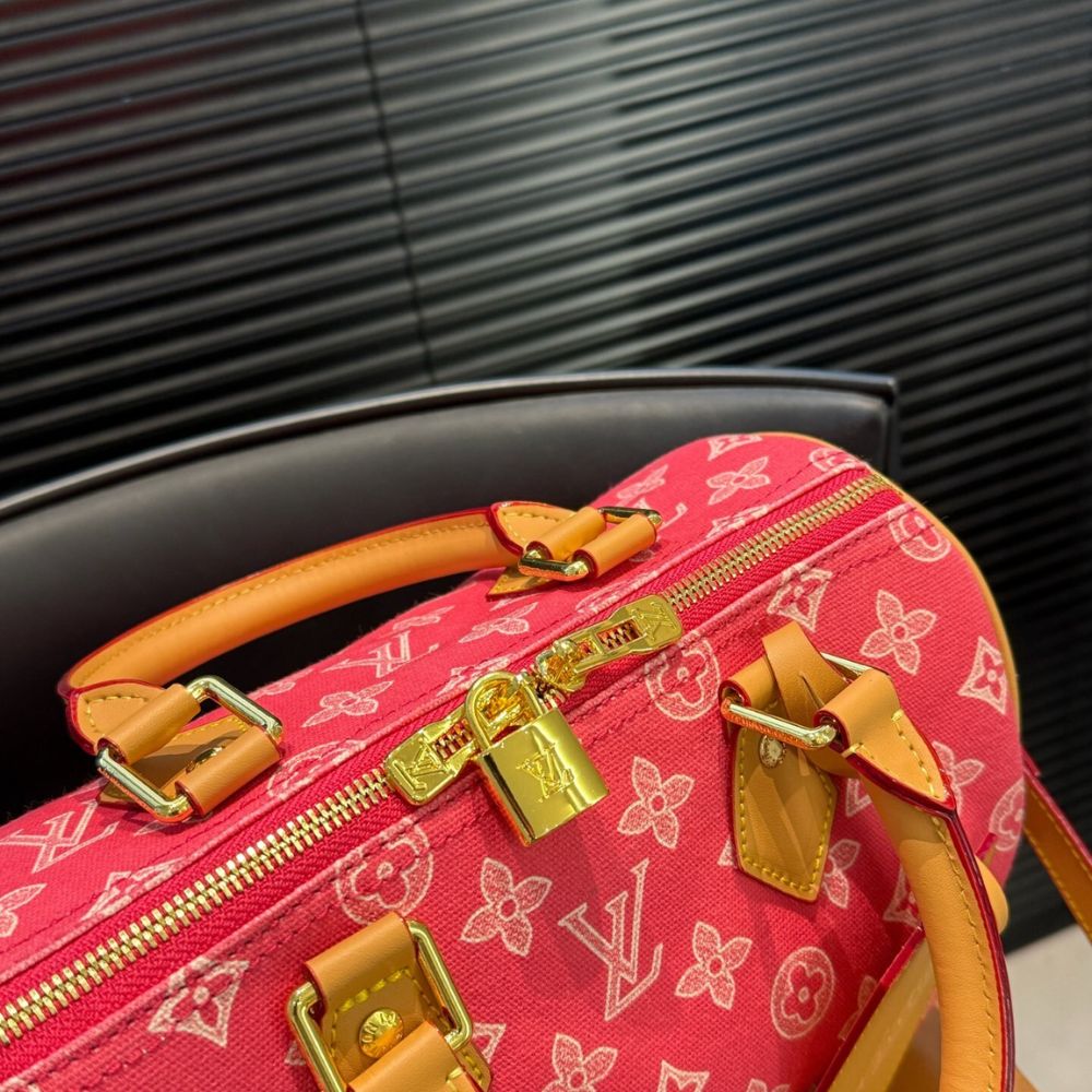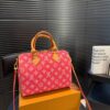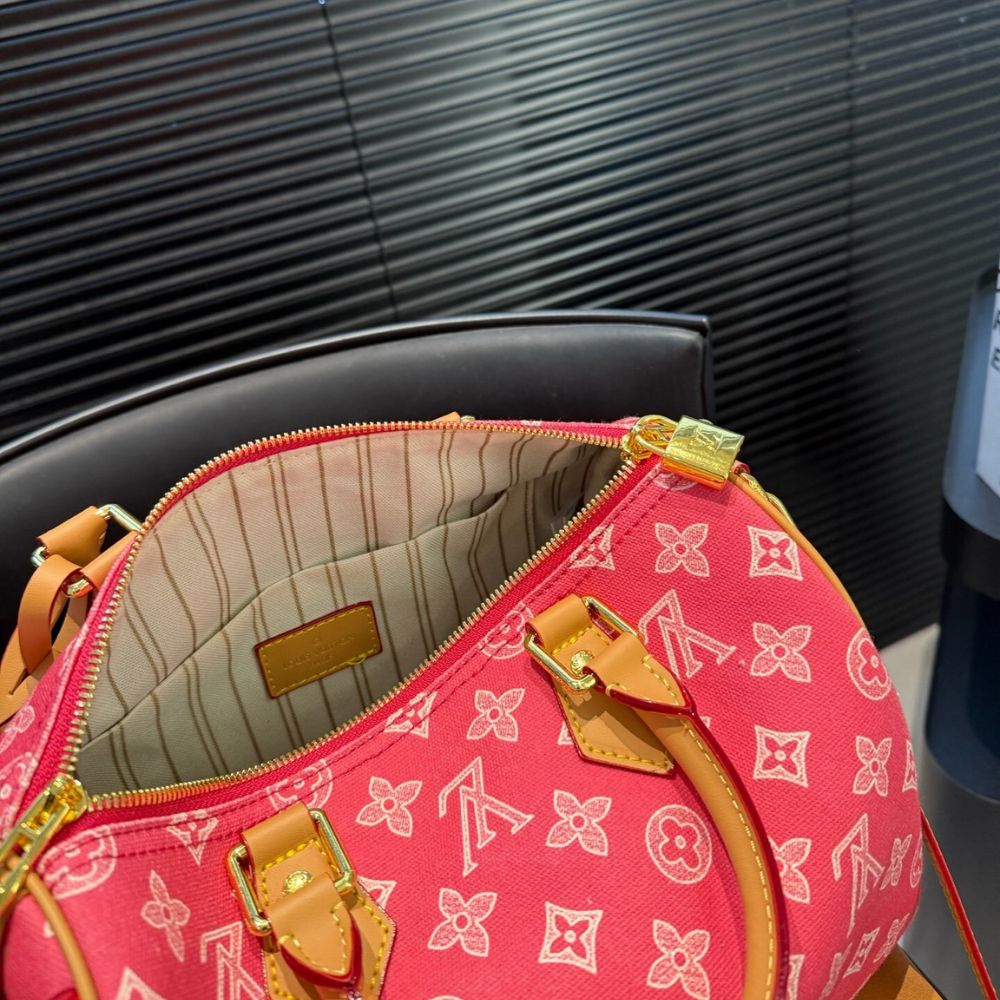The Speedy Bandoulière 25 bag is reimagined in Monogram Origine canvas, a vintage-inspired update on the iconic Louis Vuitton pattern, which celebrates its 130th anniversary in 2026. This edition is offered in a vibrant Pink hue, trimmed with a smooth strap and celebratory address tag. The compact style is perfect for everyday and includes a flat pocket inside for smaller items.