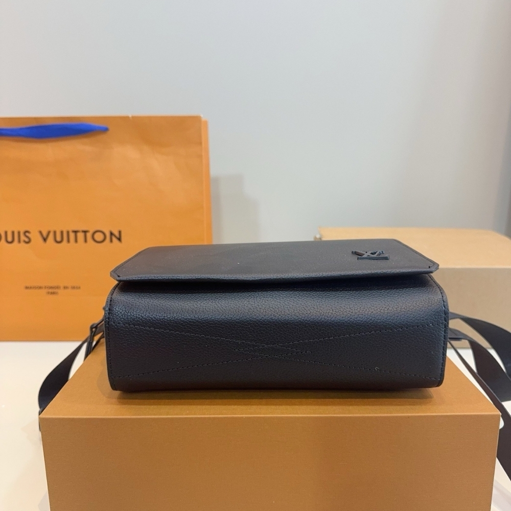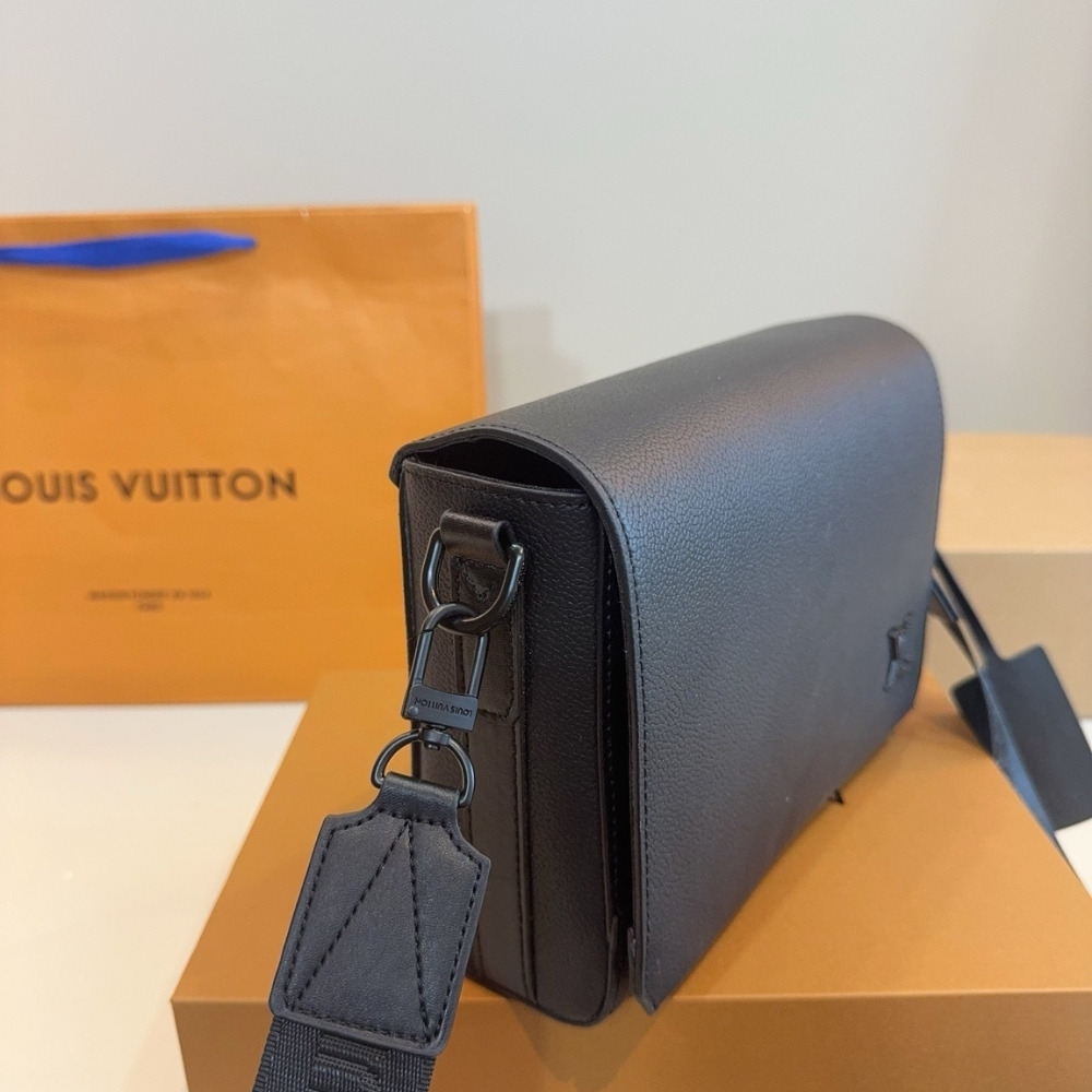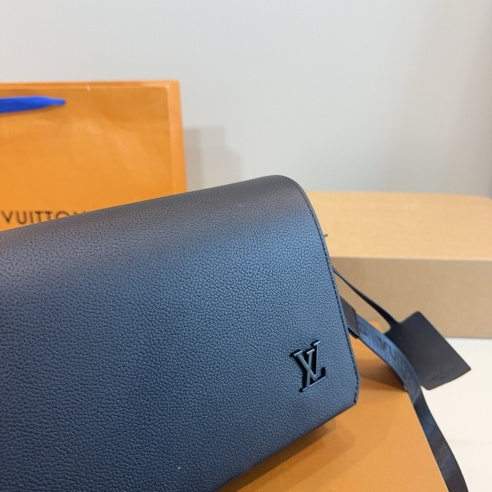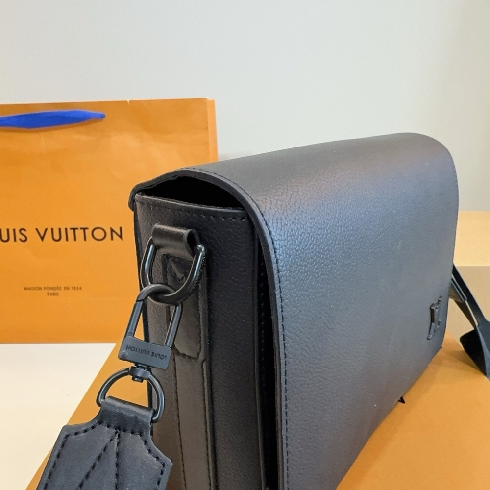 More compact than the Takeoff Messenger, the Takeoff Messenger PM bag in black leather features all the signature elements of the LV Aerogram Collection, such as cut corners on the bag’s flap and tone-on-tone LV Initials. Its body-friendly design and wide removable shoulder strap make it an excellent choice for an everyday cross-body bag.