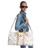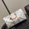 The emblematic Keepall Bandoulière 45 makes a vibrant statement in multicolored Monogram coated canvas from the re-edition of the Louis Vuitton x Murakami collection, which revisits the House’s classic signature with the Japanese artist’s playful rainbow palette. A front pocket with an S-lock closure and gleaming metallic corners add an emblematic touch, while studded bands and a bow-shaped keybell complete the look with a seasonal flourish.