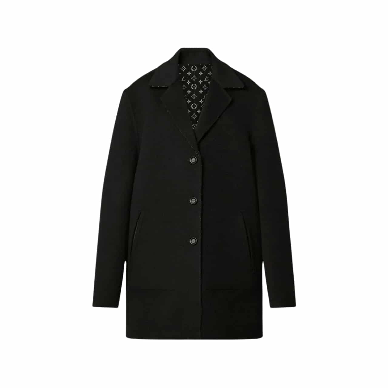 - One side of this reversible coat is signed with a Monogram jacquard for a graphic signature look, complete with sleek leather pockets.
