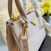 The Prada Galleria bag, which exemplifies Prada’s centennial excellence in luxury leather goods, becomes a reflection of the brand’s modernity and stylistic identity that seeks to interpret kaleidoscopic contemporaneity through a pragmatic design and structured lines. The accessory, presented in the small version, is made of iconic Saffiano leather that was patented by the founder of the brand and features a crosshatch texture and waxed finish.