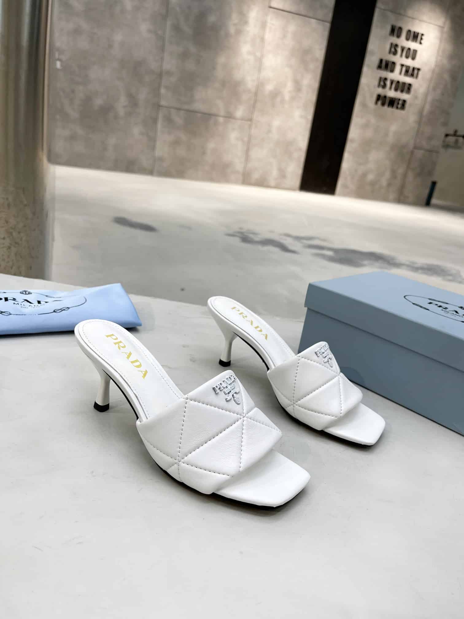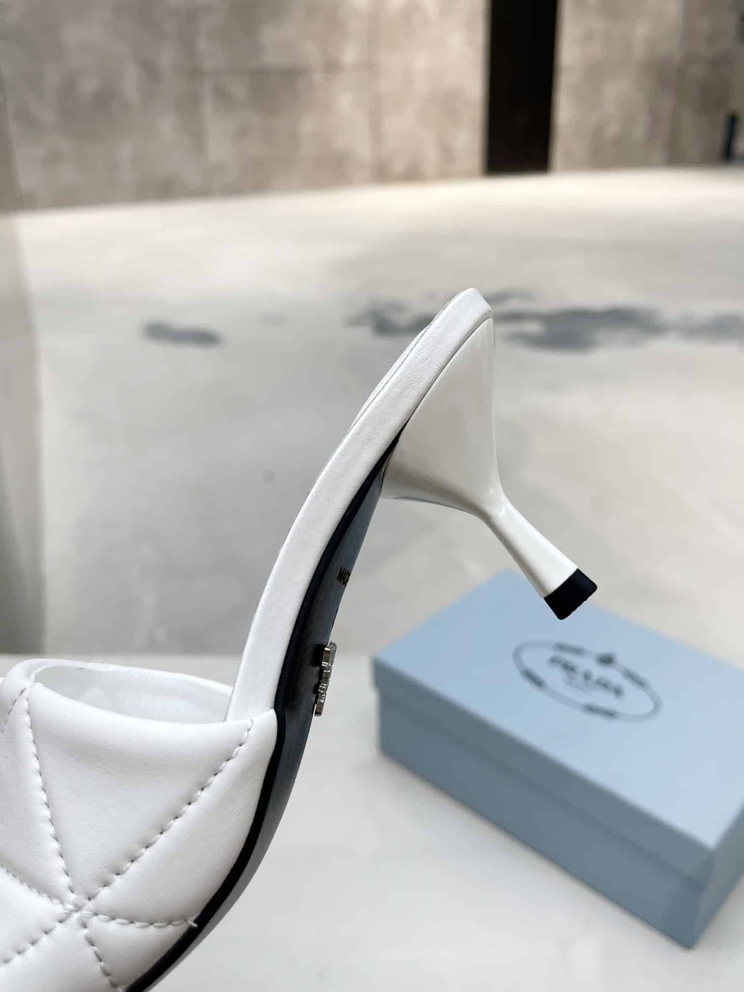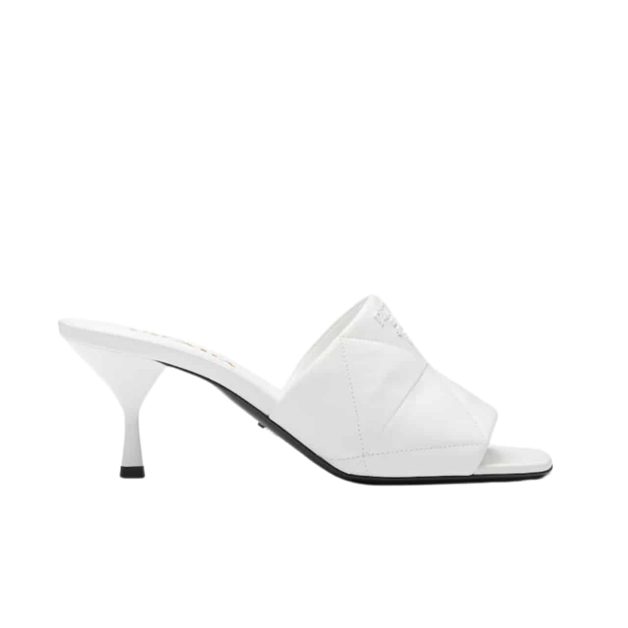 - Quilted motif of these soft nappa leather sandals with a slender heel and decorated with the enameled metal triangle log