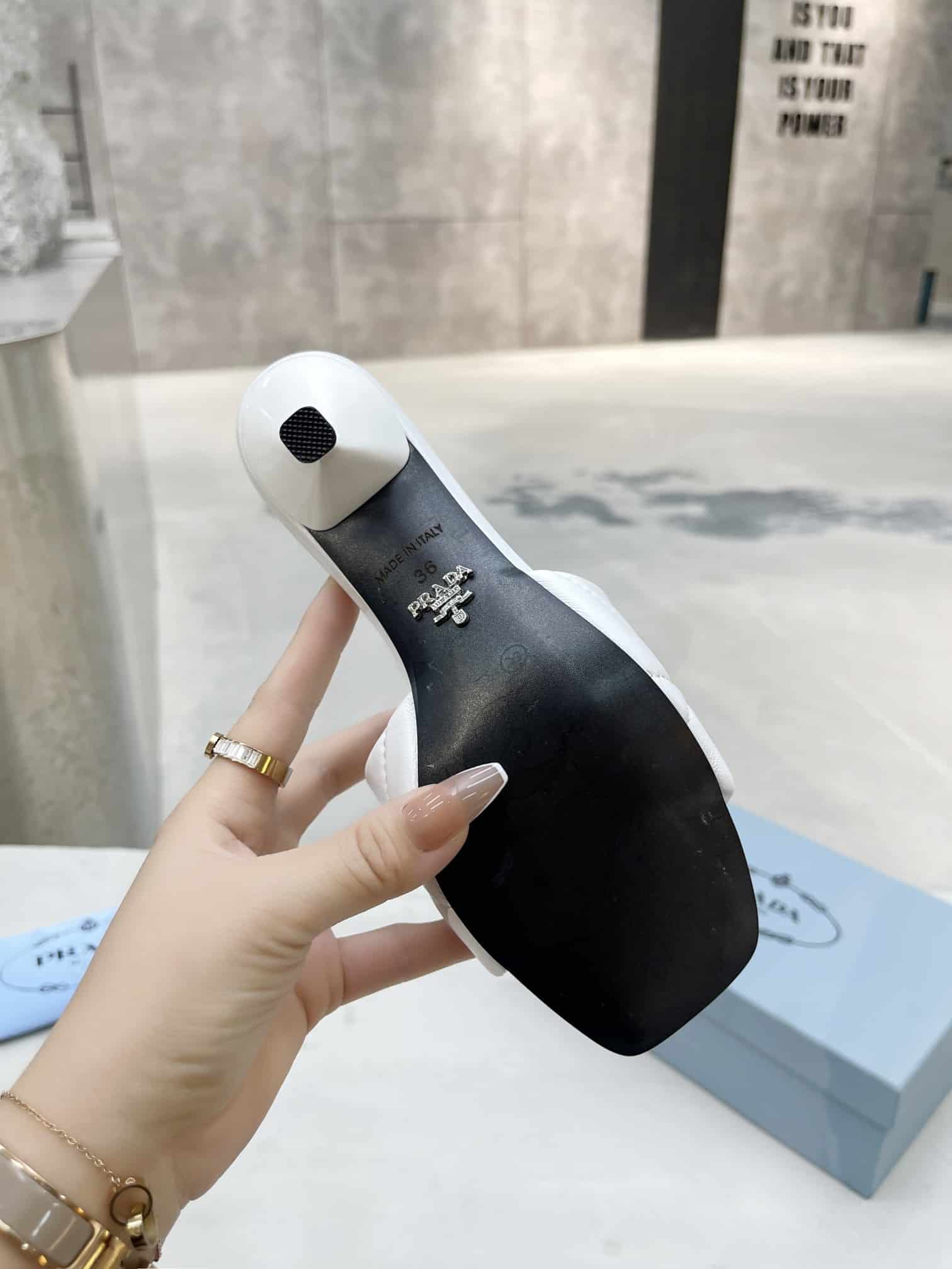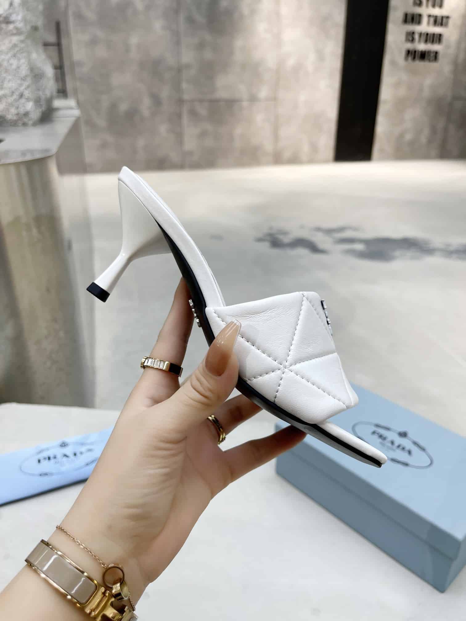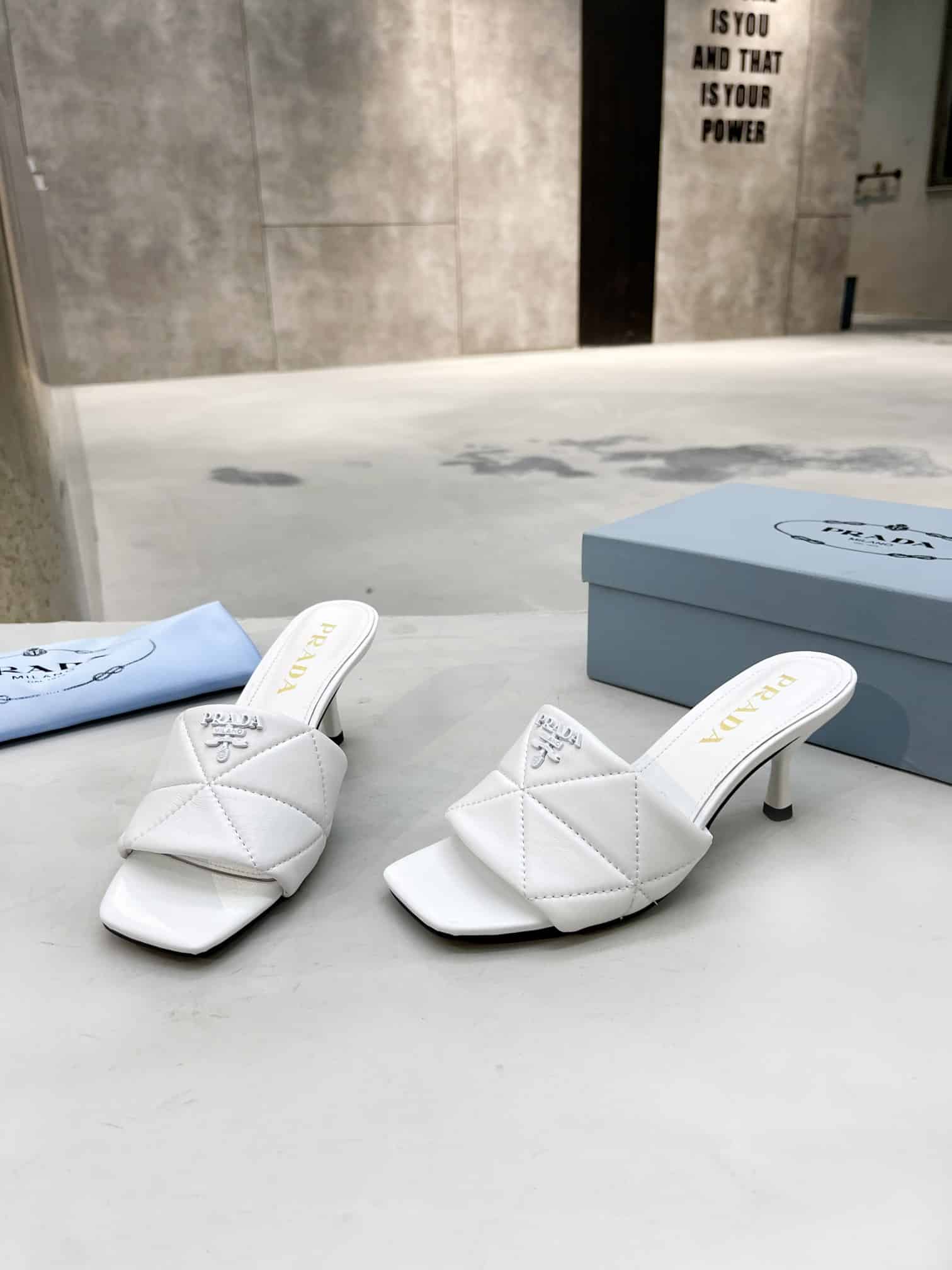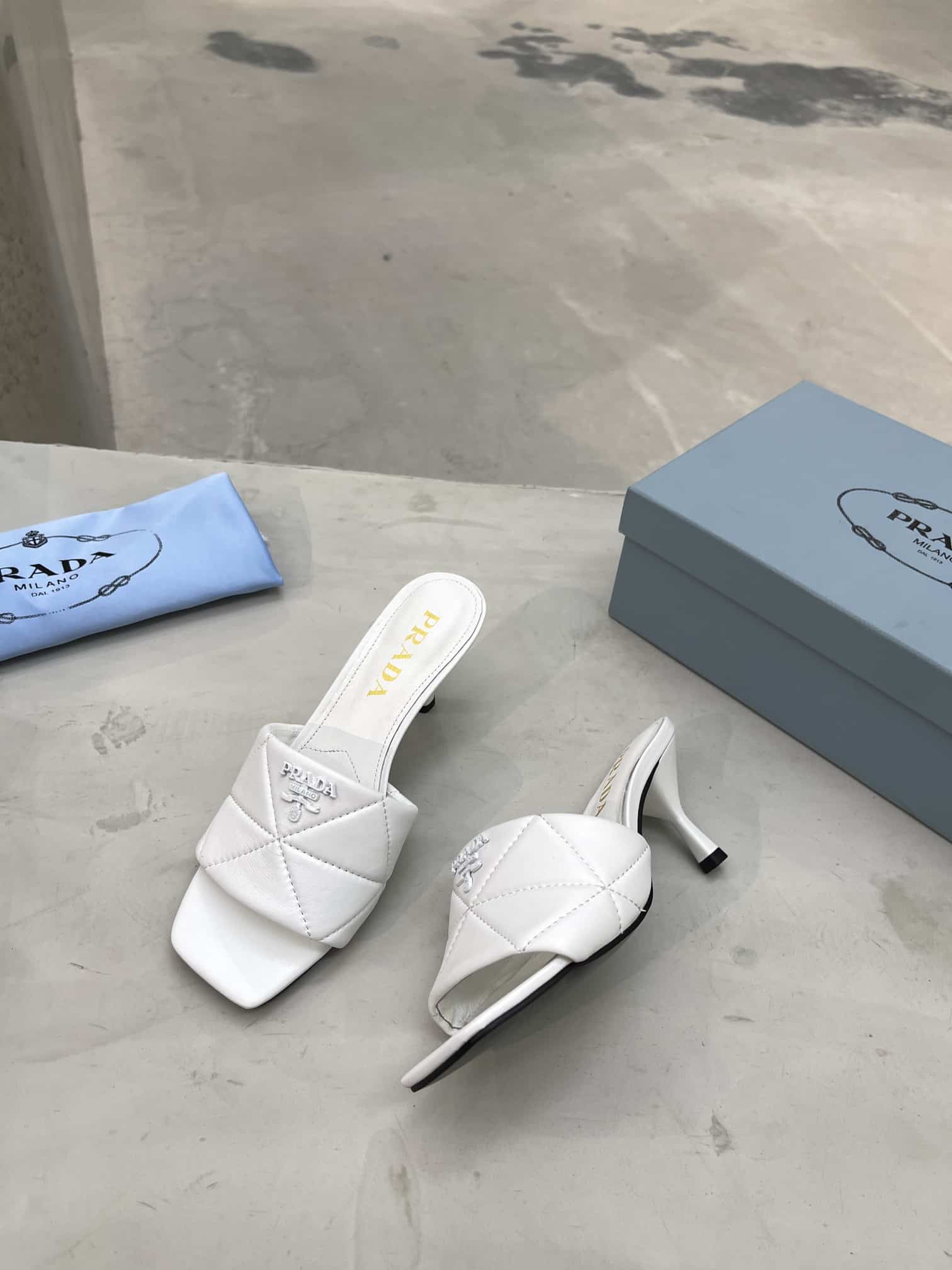 - Quilted motif of these soft nappa leather sandals with a slender heel and decorated with the enameled metal triangle log