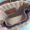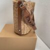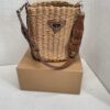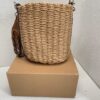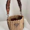 - Crocheted with raffia into the shape of a bucket, and then matched with a brown leather woven handle, as well as a triangular LOGO logo and side.