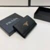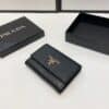 This leather wallet with the metal logo on the front flap has a compact, modern design