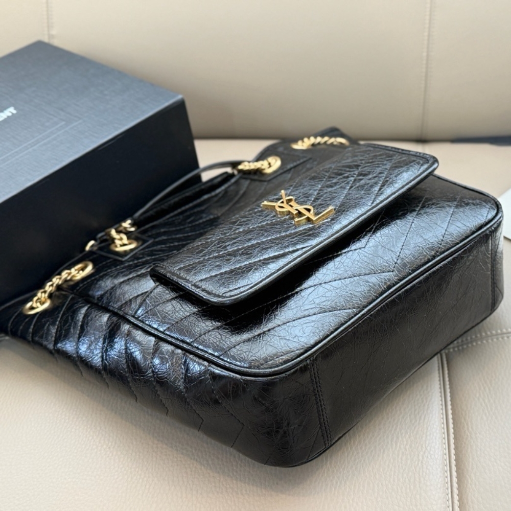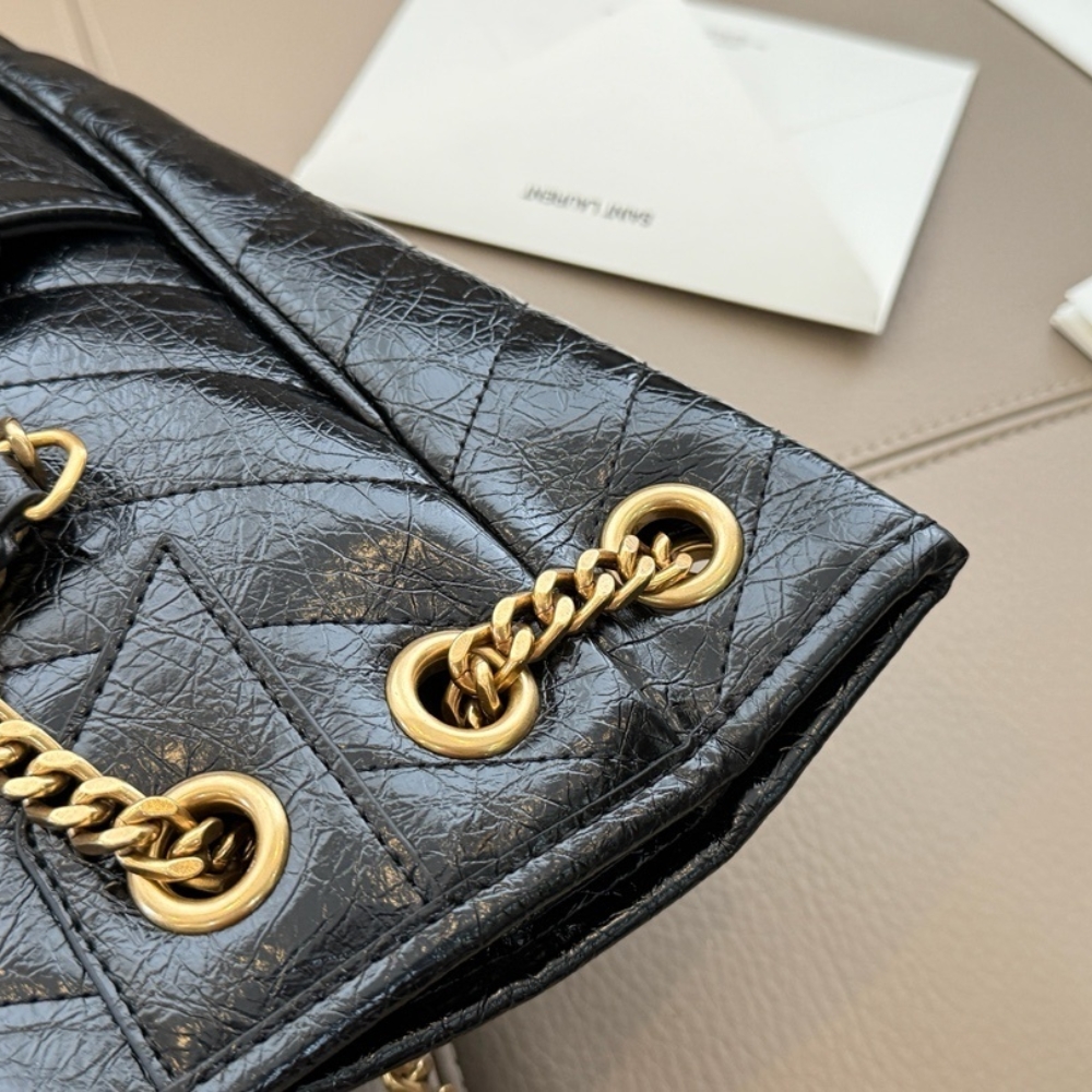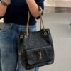 Shopping bag in vintage, decorated with the Cassandre and chevron-quilted topstitching. This lightweight, functional bag features a front pocket and sliding chain strap for both shoulder and crossbody carry.