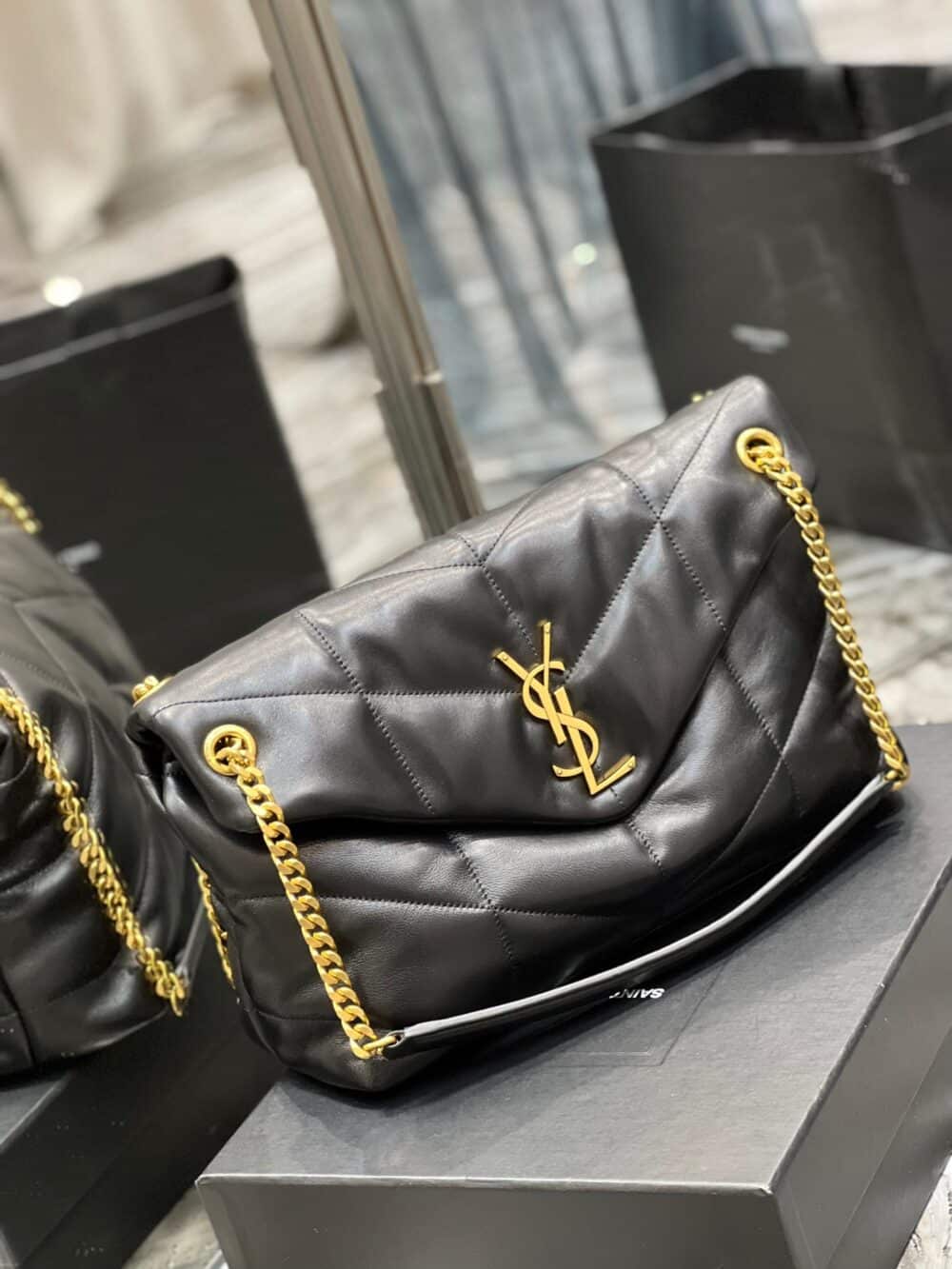 Saint Laurent Puffer Medium Chain Bag In Quilted Gold Toned Metal / Black 35cm