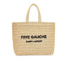 It features a natural woven design with the bold “RIVE GAUCHE SAINT LAURENT” logo embroidered on the front. The structured tote silhouette with double top handles offers both style and practicality. With its spacious 38 cm size, this bag is perfect for summer outings, beach days, or casual everyday use with a relaxed yet luxury feel.