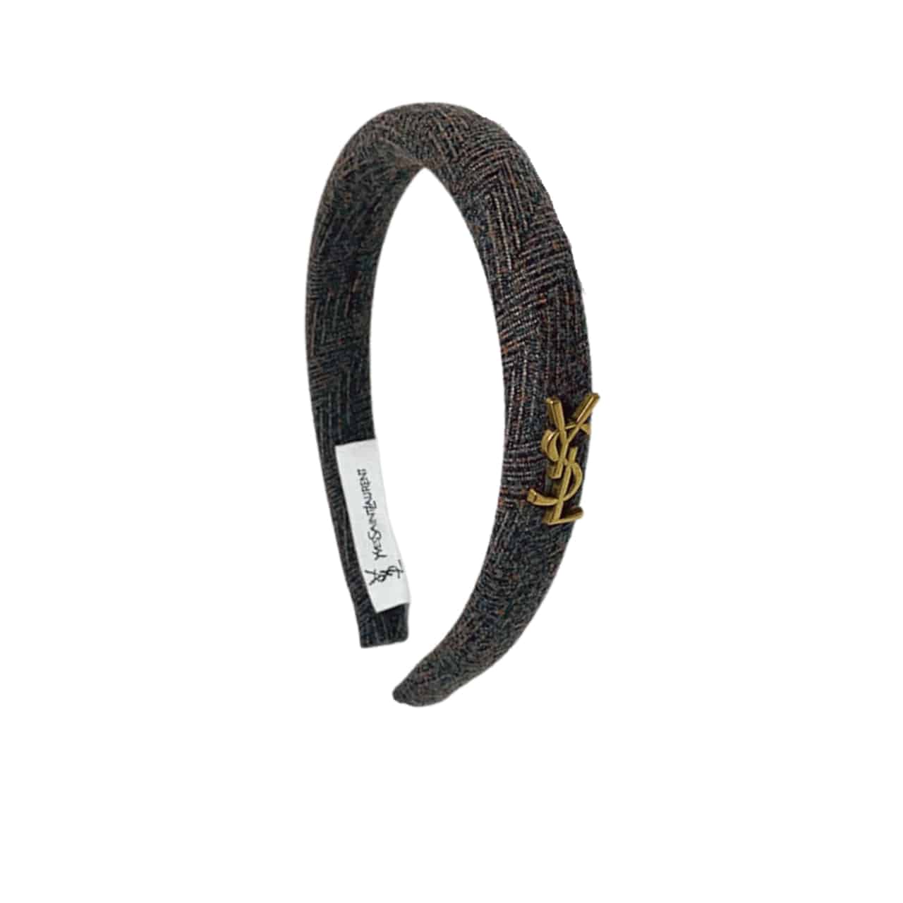 Saint Laurent Small YSL Tweed Headband With Gold Hardware In Dark Grey