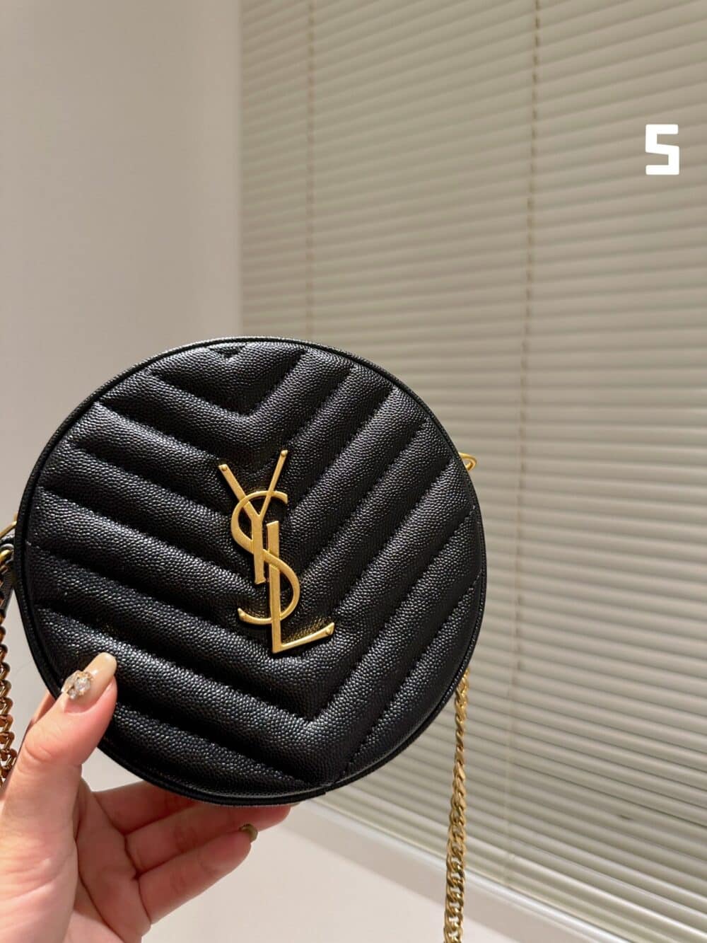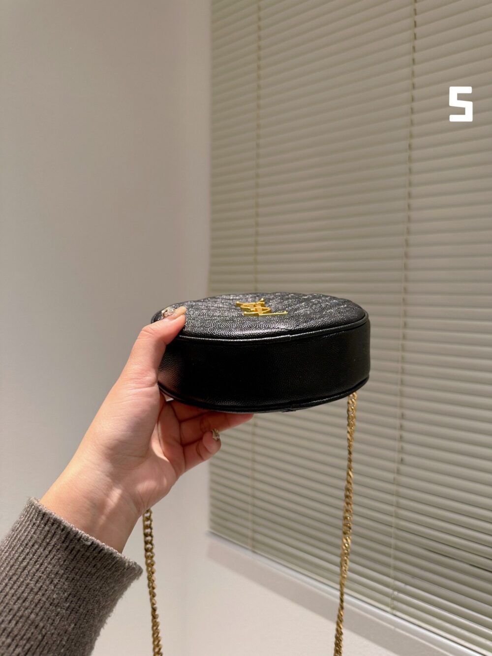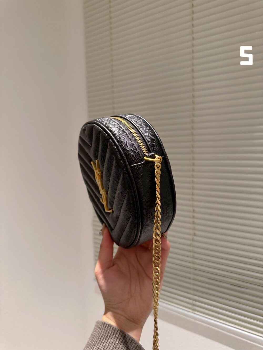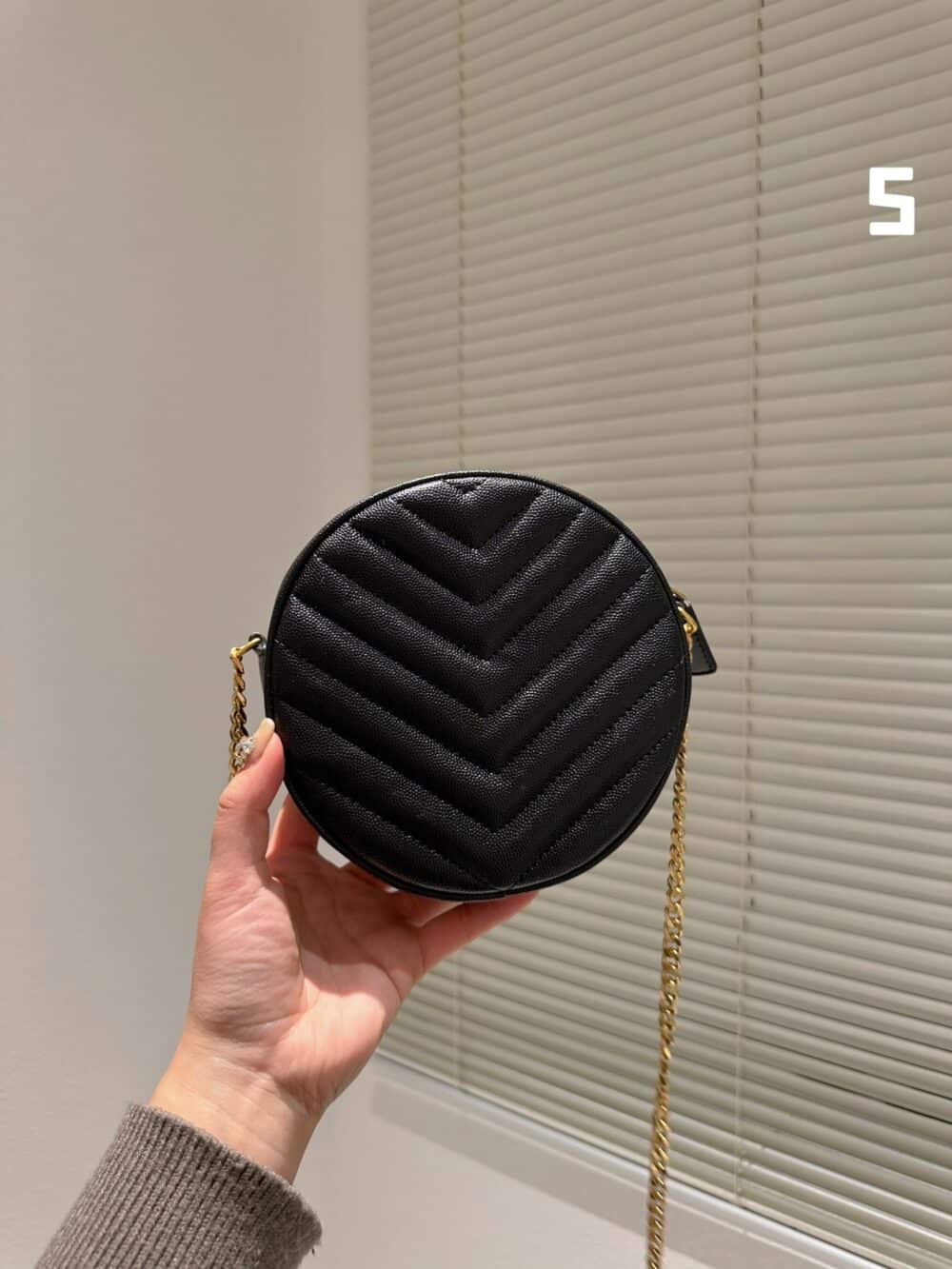 Saint Laurent Vinyle Round Camera Bag In Chevron Quilted Grain De Poudre Embossed Leather / Black 18Cm
