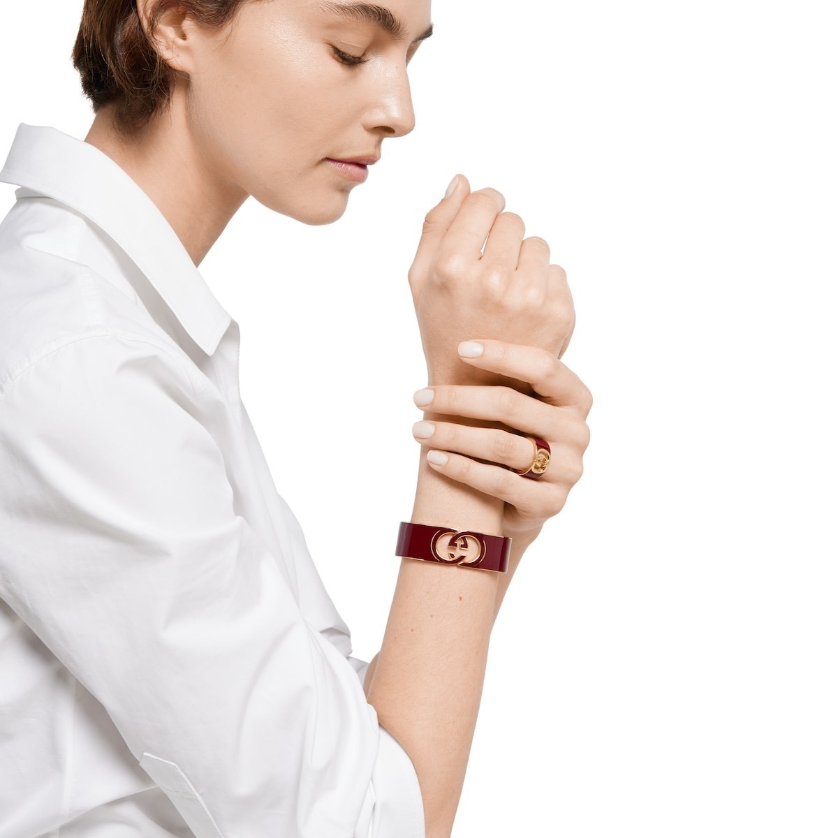 This Gucci Interlocking Set features a cuff bracelet and ring crafted in a radiant gold-tone finish with striking Gucci Rosso Ancora red enamel. Both pieces showcase a contemporary cut-out formation of the iconic Interlocking G, echoing the sophisticated color palette of the Pre-Fall 2025 collection. This coordinated set combines modern geometric design with a deep heritage hue, making it a bold and timeless statement for any luxury jewelry enthusiast.
