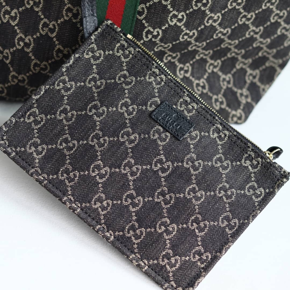 Gucci Giglio presents the black denim large tote bag, available exclusively online. The style is a tribute to the House’s Italian roots and the spirit of reinvention. Crafted in GG denim, this capacious bag features the Web trim, and is complete with a detachable pouch.