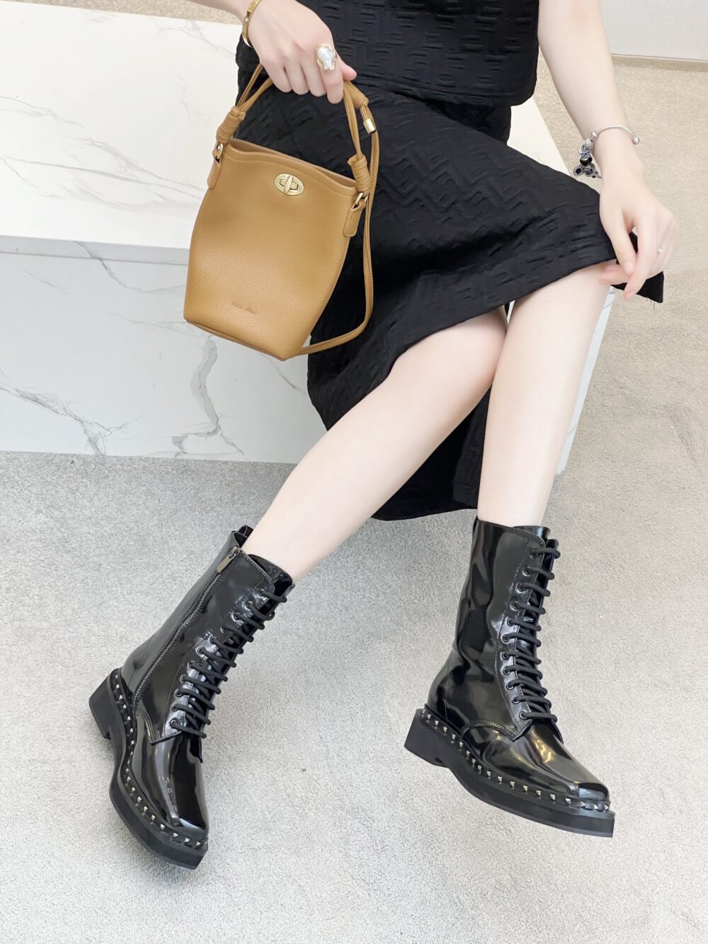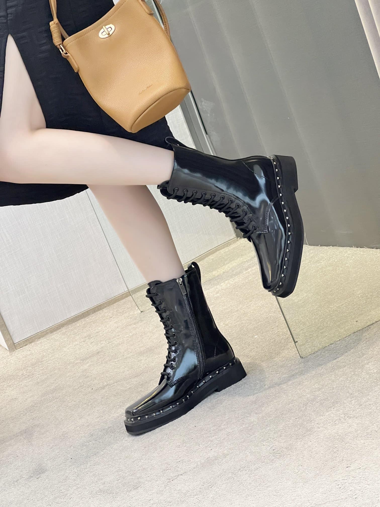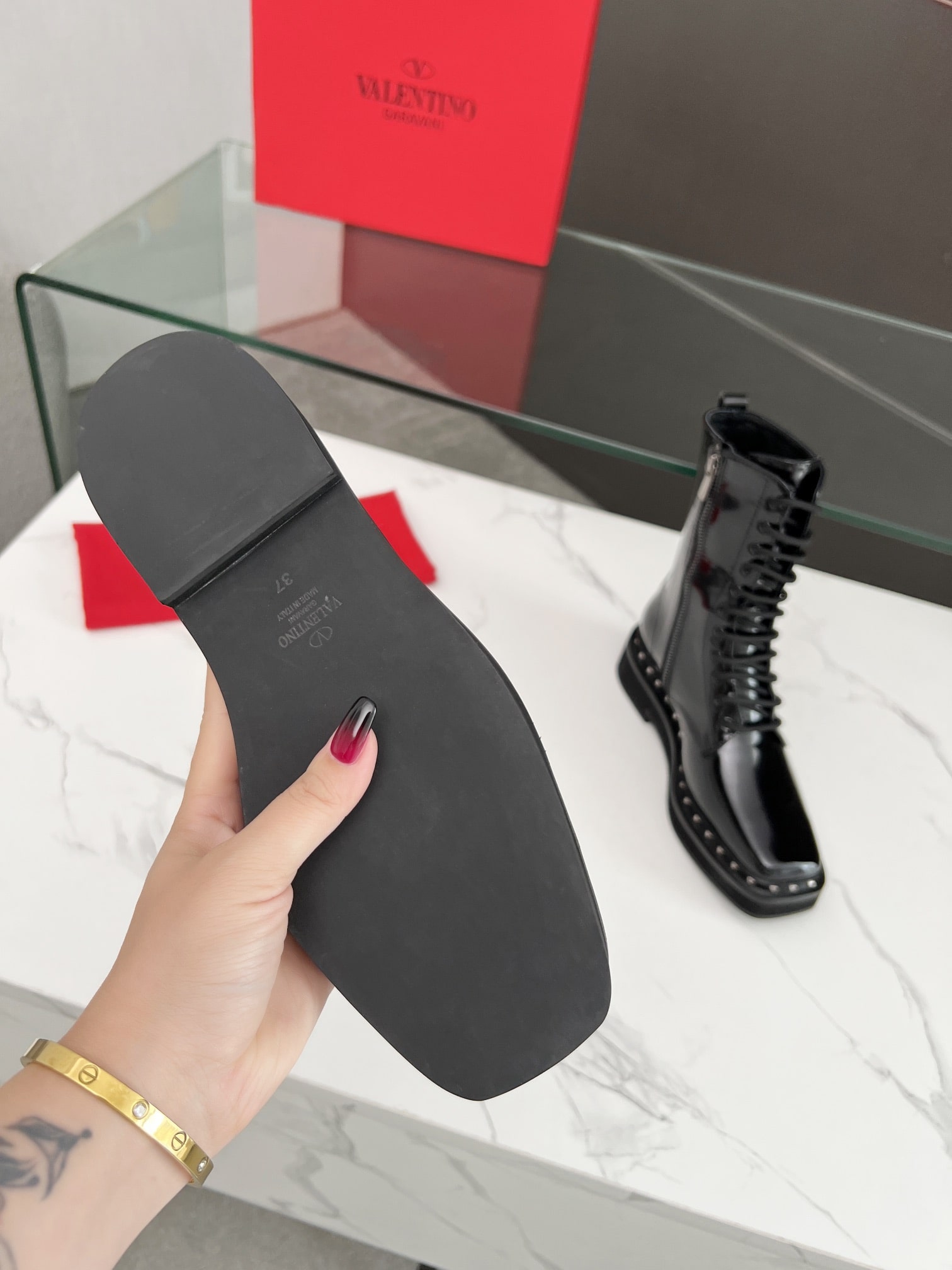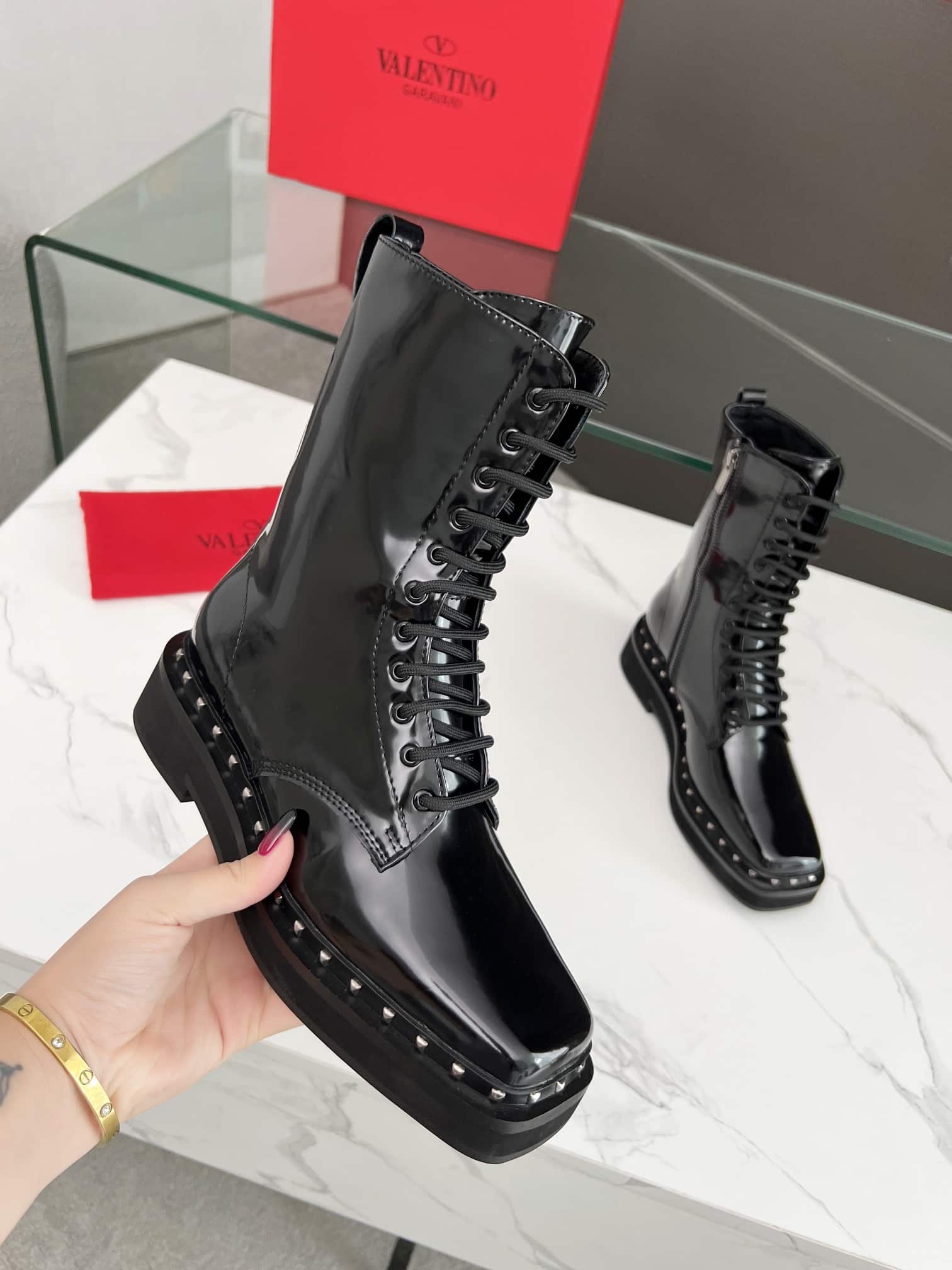 VALENTINO GARAVANI ROCKSTUD ANKLE BOOT SQUARE TOE BLACK