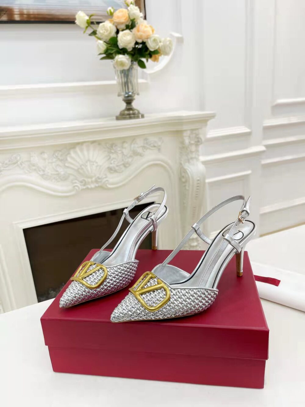 VALENTINO GARAVANI VLOGO WOVEN LEATHER SLINGBACK PUMPS SILVER