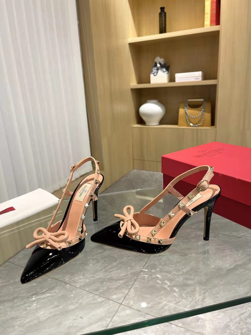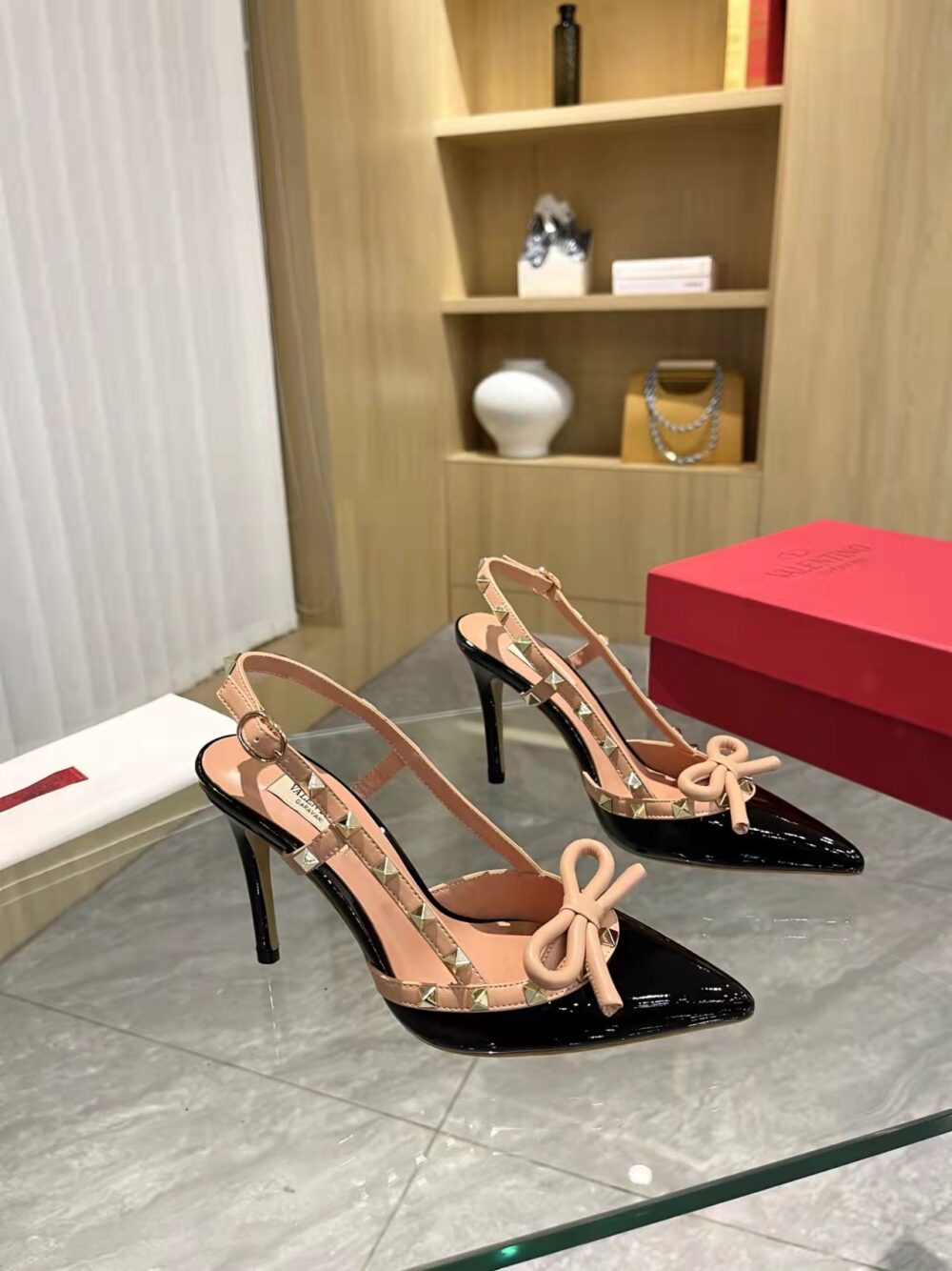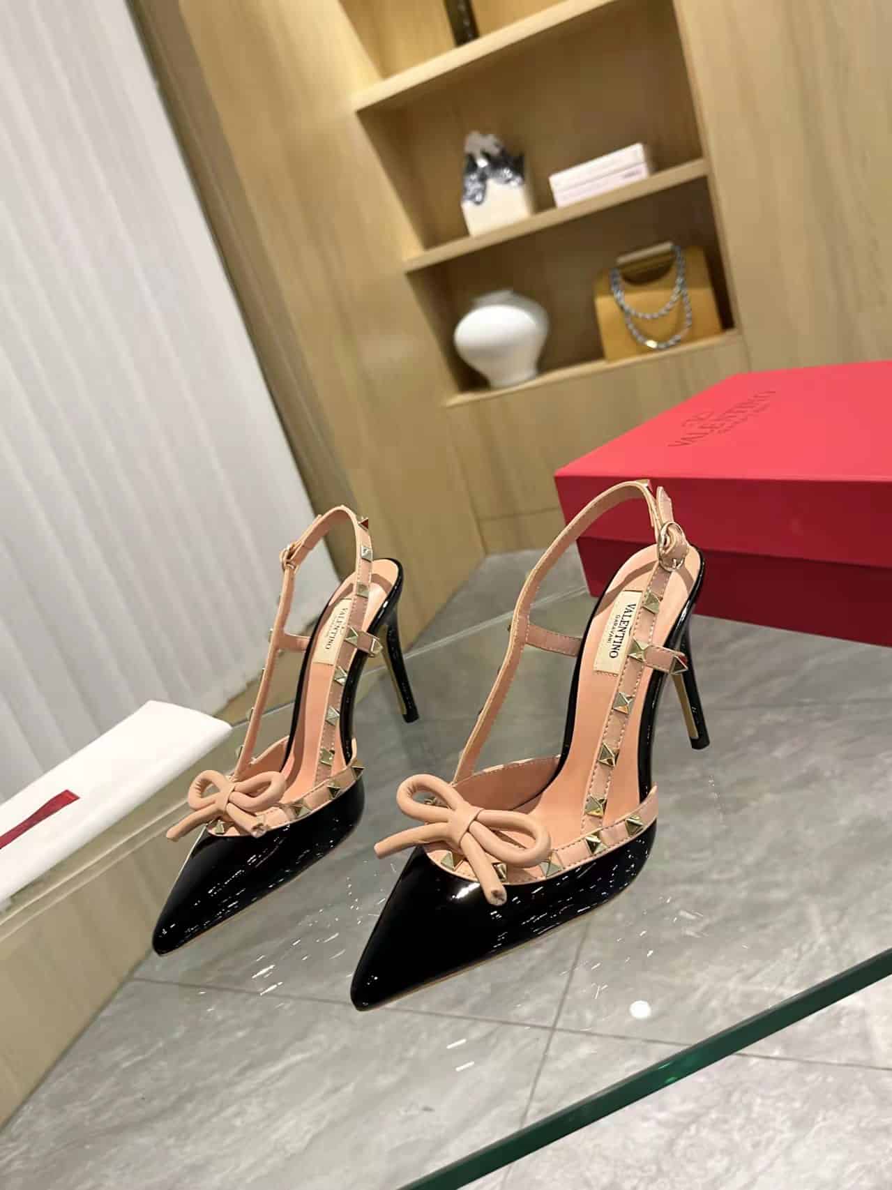 - Black pink patent leather with gunmetal-tone rockstuds and padded bow accent