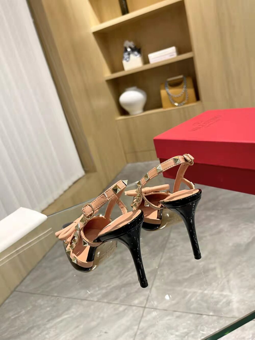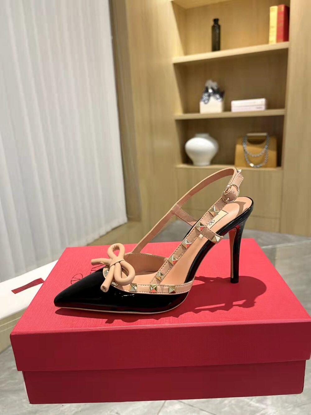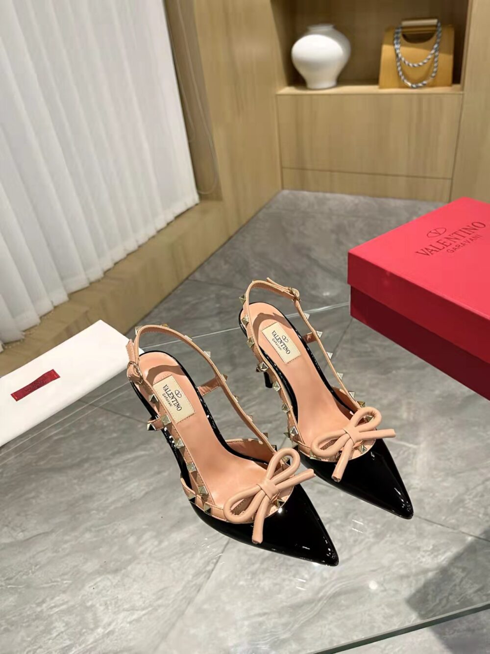 - Black pink patent leather with gunmetal-tone rockstuds and padded bow accent